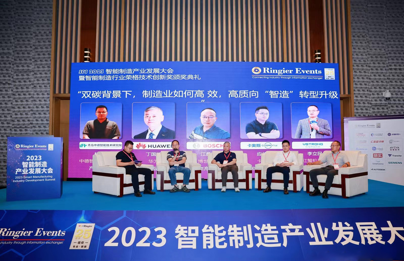 在圓桌會議環(huán)節(jié),中德智能技術(shù)研究院產(chǎn)研部部長楊志浩與華為制造軍團首席專家丁國祥、博世華域物流經(jīng)理江勇前、卡奧斯咨詢解決方案總監(jiān)應(yīng)佳明、紅蟹機器人(蘇州)有限公司副總經(jīng)理李立民圍繞“雙碳背景下,制造業(yè)如何高效,高質(zhì)向智造轉(zhuǎn)型升級”的話題進行深入交流。