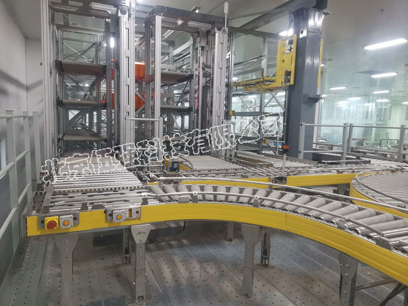 四向穿梭車系統(tǒng)通過箱式輸送線將整件貨物從二樓通過螺旋提升機(jī)送到一樓高速分揀機(jī),通過分揀系統(tǒng)分配每個(gè)訂單出口。